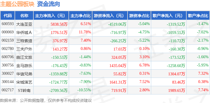 从资金流向上来看,当日主题公园板块主力资金净流入2014.15万元,游资资金净流出1309.12万元,散户资金净流出705.03万元。主题公园板块个股资金流向见下表:
