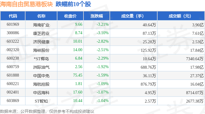 证券之星消息,11月4日海南自由贸易港板块较上一交易日下跌0.67%,海南矿业领跌。当日上证指数报收于3960.19,下跌0.41%。深证成指报收于13175.22,下跌1.71%。海南自由贸易港板块个股涨跌见下表: