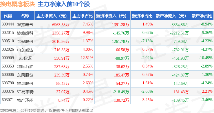 从资金流向上来看,当日换电概念板块主力资金净流出21.93亿元,游资资金净流入7.22亿元,散户资金净流入14.72亿元。换电概念板块个股资金流向见下表: