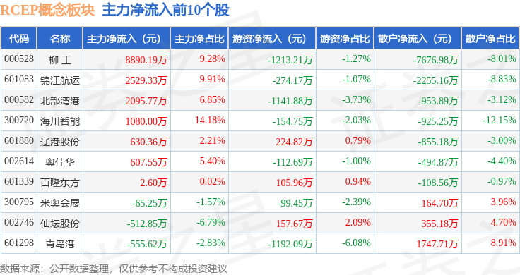 从资金流向上来看,当日RCEP概念板块主力资金净流出1.62亿元,游资资金净流入595.99万元,散户资金净流入1.56亿元。RCEP概念板块个股资金流向见下表: