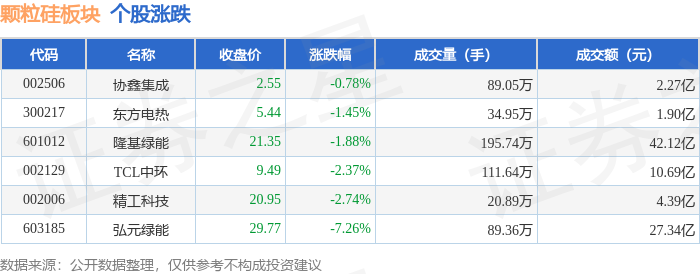 证券之星消息,11月4日颗粒硅板块较上一交易日下跌2.37%,弘元绿能领跌。当日上证指数报收于3960.19,下跌0.41%。深证成指报收于13175.22,下跌1.71%。颗粒硅板块个股涨跌见下表: