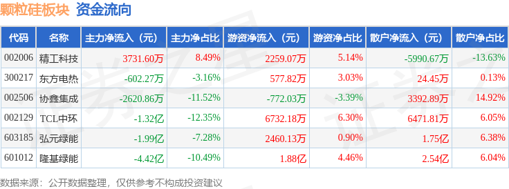 从资金流向上来看,当日颗粒硅板块主力资金净流出7.68亿元,游资资金净流入3.0亿元,散户资金净流入4.68亿元。颗粒硅板块个股资金流向见下表: