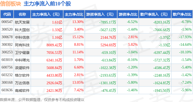 从资金流向上来看,当日信创板块主力资金净流出62.31亿元,游资资金净流入20.19亿元,散户资金净流入42.12亿元。信创板块个股资金流向见下表: