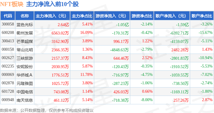 从资金流向上来看,当日NFT板块主力资金净流出12.88亿元,游资资金净流入1.89亿元,散户资金净流入10.99亿元。NFT板块个股资金流向见下表: