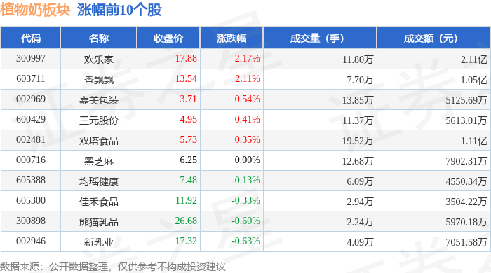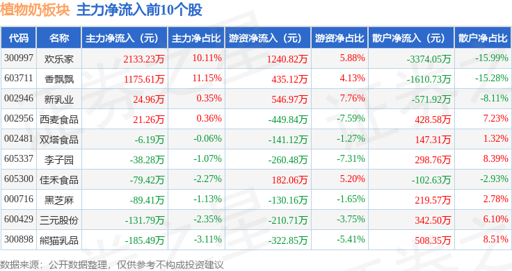 从资金流向上来看,当日植物奶板块主力资金净流出2.0亿元,游资资金净流入6785.81万元,散户资金净流入1.32亿元。植物奶板块个股资金流向见下表: