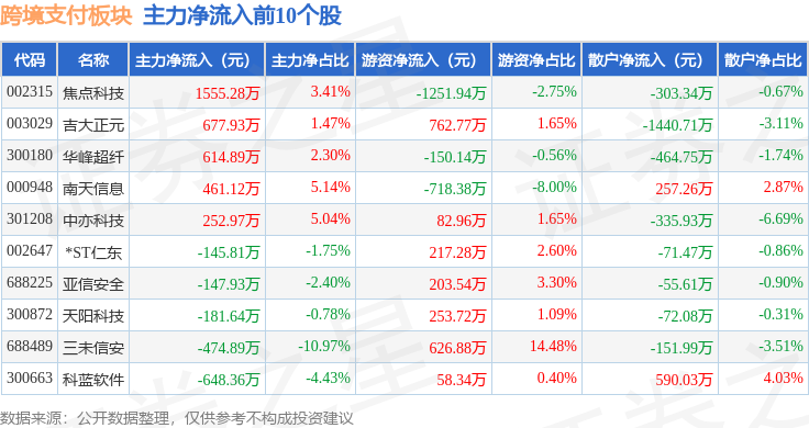 从资金流向上来看,当日跨境支付板块主力资金净流出21.27亿元,游资资金净流入6.71亿元,散户资金净流入14.55亿元。跨境支付板块个股资金流向见下表: