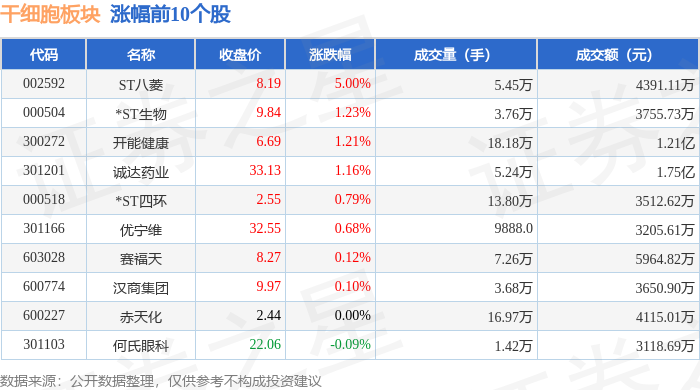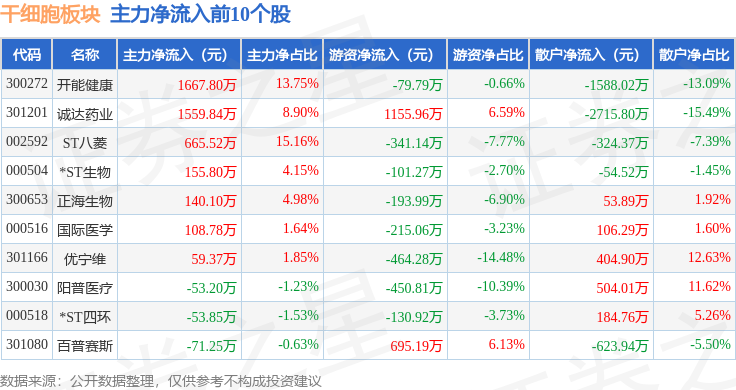 从资金流向上来看,当日干细胞板块主力资金净流出5.21亿元,游资资金净流入1.44亿元,散户资金净流入3.77亿元。干细胞板块个股资金流向见下表: