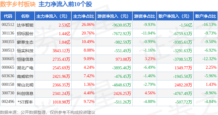 从资金流向上来看,当日数字乡村板块主力资金净流出13.68亿元,游资资金净流入4.66亿元,散户资金净流入9.01亿元。数字乡村板块个股资金流向见下表: