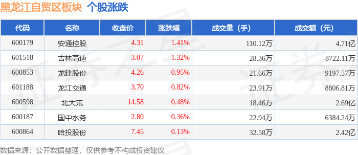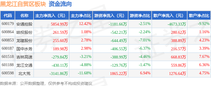 从资金流向上来看,当日黑龙江自贸区板块主力资金净流入2710.37万元,游资资金净流出1428.44万元,散户资金净流出1281.93万元。黑龙江自贸区板块个股资金流向见下表:
