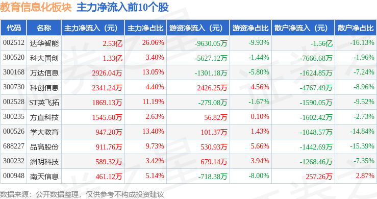 从资金流向上来看,当日教育信息化板块主力资金净流出13.75亿元,游资资金净流入2.71亿元,散户资金净流入11.04亿元。教育信息化板块个股资金流向见下表:
