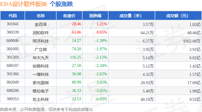 证券之星消息,11月4日EDA设计软件板块较上一交易日下跌2.08%,东土科技领跌。当日上证指数报收于3960.19,下跌0.41%。深证成指报收于13175.22,下跌1.71%。EDA设计软件板块个股涨跌见下表: