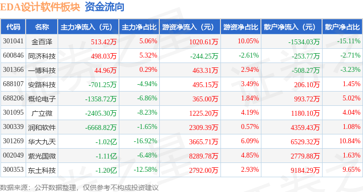 从资金流向上来看,当日EDA设计软件板块主力资金净流出4.33亿元,游资资金净流入2.04亿元,散户资金净流入2.29亿元。EDA设计软件板块个股资金流向见下表: