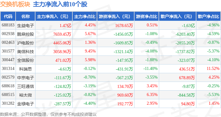 从资金流向上来看,当日交换机板块主力资金净流出18.44亿元,游资资金净流入5.76亿元,散户资金净流入12.68亿元。交换机板块个股资金流向见下表: