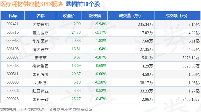 证券之星消息,11月4日医疗耗材供应链SPD板块较上一交易日下跌0.88%,达实智能领跌。当日上证指数报收于3960.19,下跌0.41%。深证成指报收于13175.22,下跌1.71%。医疗耗材供应链SPD板块个股涨跌见下表: