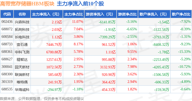 从资金流向上来看,当日高带宽存储器HBM板块主力资金净流出5.51亿元,游资资金净流入4.06亿元,散户资金净流入1.45亿元。高带宽存储器HBM板块个股资金流向见下表: