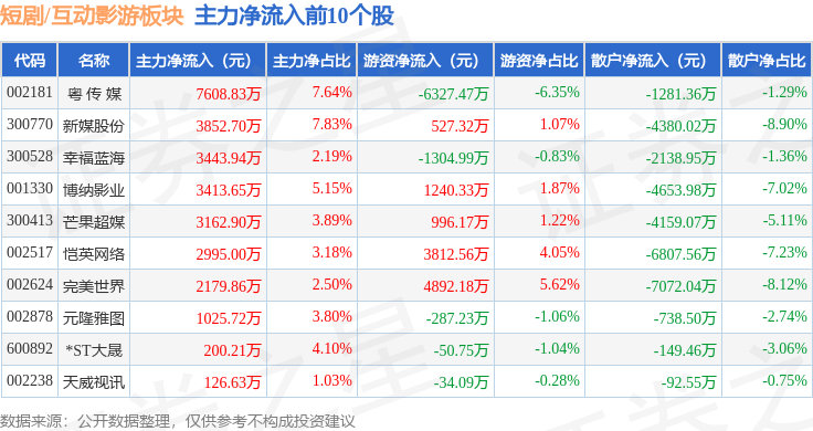从资金流向上来看,当日短剧/互动影游板块主力资金净流出13.1亿元,游资资金净流出1728.74万元,散户资金净流入13.28亿元。短剧/互动影游板块个股资金流向见下表: