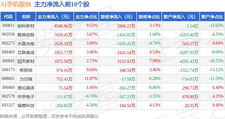 从资金流向上来看,当日AI手机板块主力资金净流出33.08亿元,游资资金净流入8.98亿元,散户资金净流入24.1亿元。AI手机板块个股资金流向见下表: