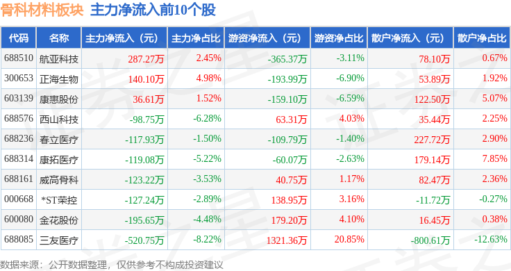 从资金流向上来看,当日骨科材料板块主力资金净流出4.16亿元,游资资金净流入1.31亿元,散户资金净流入2.85亿元。骨科材料板块个股资金流向见下表: