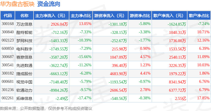 从资金流向上来看,当日华为盘古板块主力资金净流出5.6亿元,游资资金净流入5333.8万元,散户资金净流入5.06亿元。华为盘古板块个股资金流向见下表:
