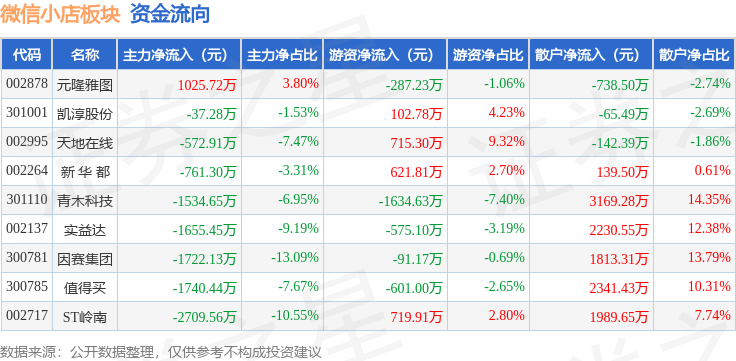 从资金流向上来看,当日微信小店板块主力资金净流出9708.0万元,游资资金净流出1029.33万元,散户资金净流入1.07亿元。微信小店板块个股资金流向见下表: