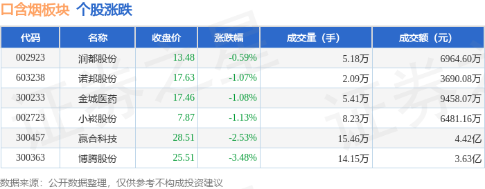 证券之星消息,11月4日口含烟板块较上一交易日下跌2.28%,博腾股份领跌。当日上证指数报收于3960.19,下跌0.41%。深证成指报收于13175.22,下跌1.71%。口含烟板块个股涨跌见下表: