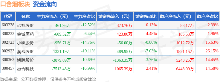 从资金流向上来看,当日口含烟板块主力资金净流出1.48亿元,游资资金净流出46.37万元,散户资金净流入1.48亿元。口含烟板块个股资金流向见下表: