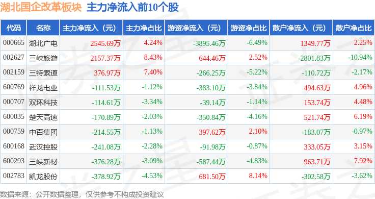 从资金流向上来看,当日湖北国企改革板块主力资金净流出5.65亿元,游资资金净流入7251.68万元,散户资金净流入4.92亿元。湖北国企改革板块个股资金流向见下表: