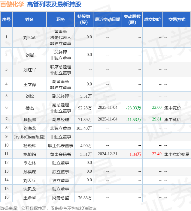 百傲化学的高管列表及最新持股情况如下: