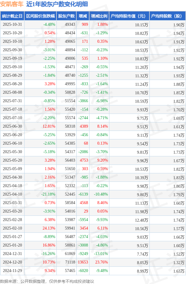从股价来看,2025年10月20日至2025年10月31日,安凯客车区间跌幅为4.48%,在此期间股东户数增加909.0户,增幅为1.88%。
