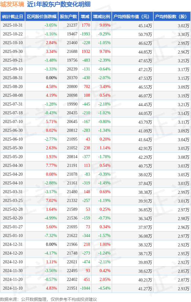 从股价来看,2025年10月22日至2025年10月31日,城发环境区间跌幅为3.05%,在此期间股东户数增加1770.0户,增幅为9.09%。