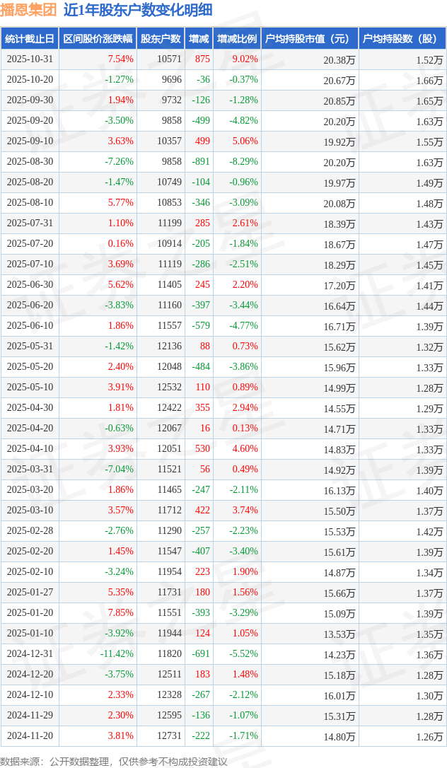 从股价来看,2025年10月20日至2025年10月31日,播恩集团区间涨幅为7.54%,在此期间股东户数增加875.0户,增幅为9.02%。