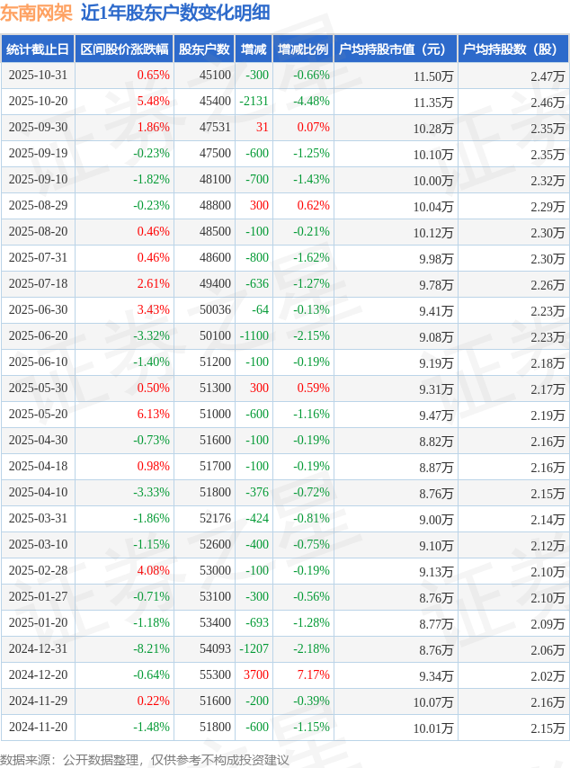 从股价来看,2025年10月20日至2025年10月31日,东南网架区间涨幅为0.65%,在此期间股东户数减少300.0户,减幅为0.66%。