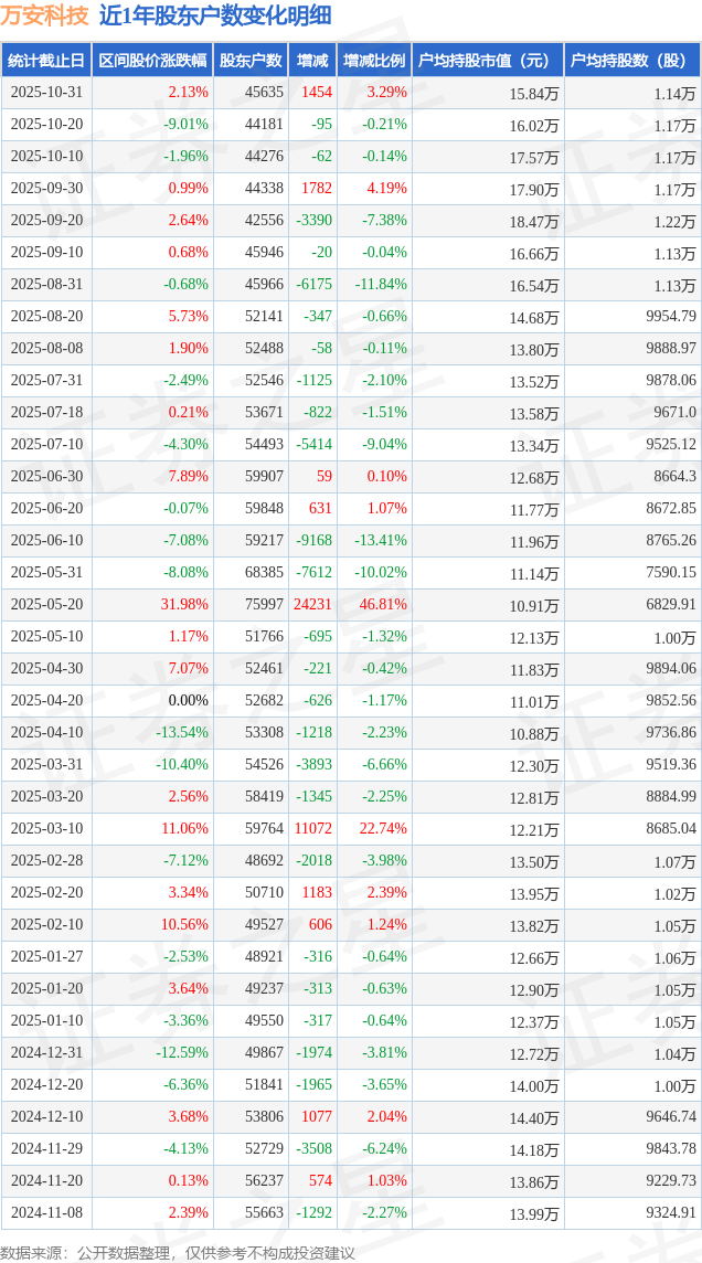 从股价来看,2025年10月20日至2025年10月31日,万安科技区间涨幅为2.13%,在此期间股东户数增加1454.0户,增幅为3.29%。