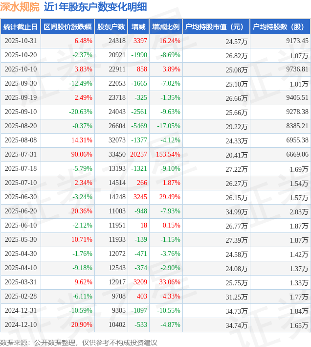 从股价来看,2025年10月20日至2025年10月31日,深水规院区间涨幅为6.48%,在此期间股东户数增加3397.0户,增幅为16.24%。