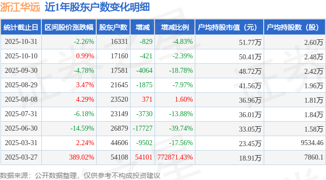 从股价来看,2025年10月10日至2025年10月31日,浙江华远区间跌幅为2.26%,在此期间股东户数减少829.0户,减幅为4.83%。