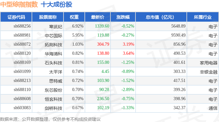 中型综指(000020)指数十大成份股详情如下: