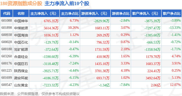 资金流向方面,180资源(000026)指数成份股当日主力资金净流出合计38.96亿元,游资资金净流入合计2.62亿元,散户资金净流入合计36.34亿元。成份股资金流向详情见下表: