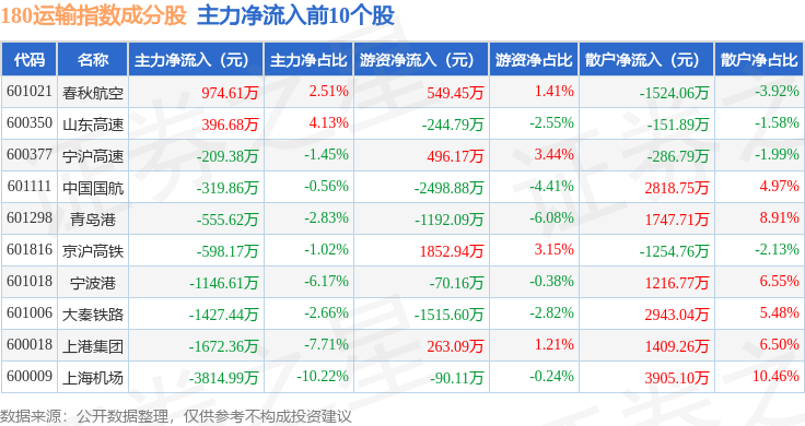 资金流向方面,180运输(000027)指数成份股当日主力资金净流出合计4.6亿元,游资资金净流入合计7497.97万元,散户资金净流入合计3.85亿元。成份股资金流向详情见下表: