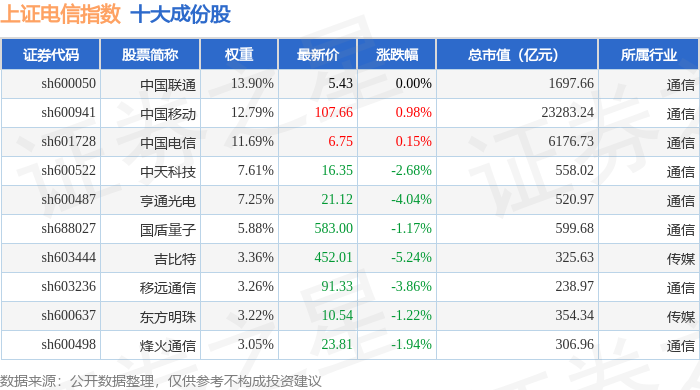 证券之星消息,11月4日,上证电信(000040)指数报收于3961.53点,跌0.97%,成交237.02亿元,换手率0.85%。当日该指数成份股中,上涨的有10家,中国电影以4.32%的涨幅领涨,下跌的有17家,吉比特以5.24%的跌幅领跌。