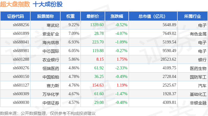 证券之星消息,11月4日,超大盘(000043)指数报收于2621.4点,跌0.15%,成交711.48亿元,换手率0.25%。当日该指数成份股中,上涨的有10家,招商银行以2.92%的涨幅领涨,下跌的有10家,紫金矿业以4.07%的跌幅领跌。