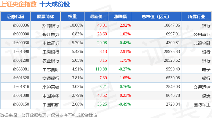 证券之星消息,11月4日,上证央企(000042)指数报收于1842.59点,涨0.46%,成交741.63亿元,换手率0.32%。当日该指数成份股中,上涨的有19家,招商银行以2.92%的涨幅领涨,下跌的有26家,中金黄金以5.18%的跌幅领跌。