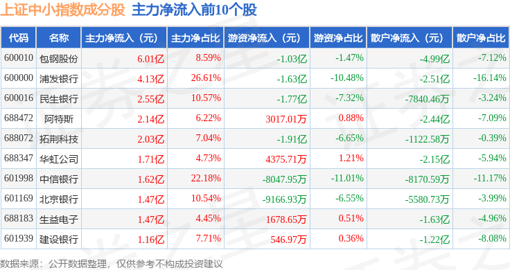 资金流向方面,上证中小(000046)指数成份股当日主力资金净流出合计186.4亿元,游资资金净流入合计69.5亿元,散户资金净流入合计116.91亿元。成份股资金流向详情见下表: