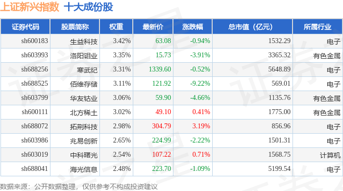 证券之星消息,11月4日,上证新兴(000067)指数报收于8879.71点,跌1.43%,成交1238.25亿元,换手率1.24%。当日该指数成份股中,上涨的有7家,中微公司以5.38%的涨幅领涨,下跌的有42家,佰维存储以9.22%的跌幅领跌。