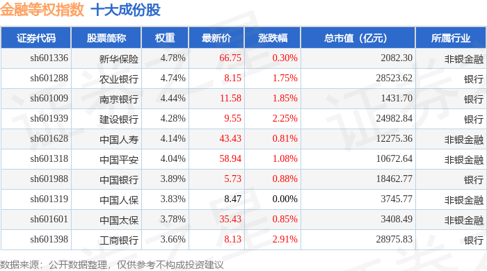 证券之星消息,11月4日,金融等权(000076)指数报收于5712.63点,涨1.31%,成交510.75亿元,换手率0.35%。当日该指数成份股中,上涨的有23家,中信银行以3.31%的涨幅领涨,下跌的有6家,中国银河以0.97%的跌幅领跌。