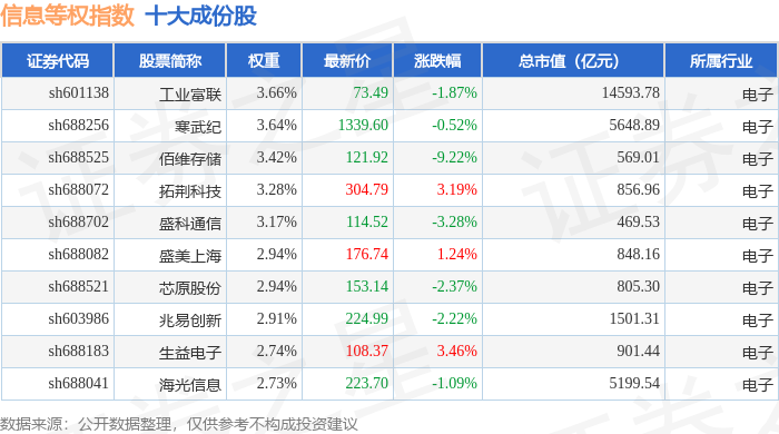 证券之星消息,11月4日,信息等权(000077)指数报收于6094.82点,跌1.07%,成交1075.92亿元,换手率2.01%。当日该指数成份股中,上涨的有11家,中微公司以5.38%的涨幅领涨,下跌的有39家,佰维存储以9.22%的跌幅领跌。