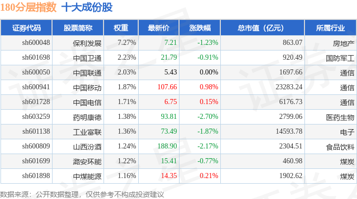 证券之星消息,11月4日,180分层(000093)指数报收于12252.4点,跌0.85%,成交2813.81亿元,换手率0.61%。当日该指数成份股中,上涨的有61家,中微公司以5.38%的涨幅领涨,下跌的有112家,招商轮船以9.54%的跌幅领跌。