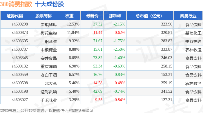 证券之星消息,11月4日,380消费(000108)指数报收于12171.06点,跌0.92%,成交39.2亿元,换手率1.06%。当日该指数成份股中,上涨的有4家,千禾味业以0.84%的涨幅领涨,下跌的有16家,中粮糖业以2.5%的跌幅领跌。