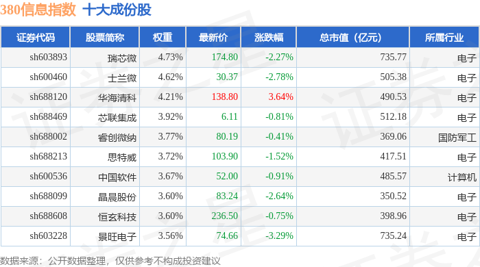 证券之星消息,11月4日,380信息(000111)指数报收于9625.71点,跌1.62%,成交267.38亿元,换手率1.85%。当日该指数成份股中,上涨的有4家,华海清科以3.64%的涨幅领涨,下跌的有42家,聚辰股份以4.54%的跌幅领跌。