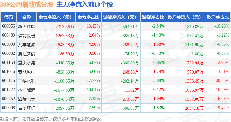 资金流向方面,380公用(000113)指数成份股当日主力资金净流出合计2.63亿元,游资资金净流入合计1819.29万元,散户资金净流入合计2.45亿元。成份股资金流向详情见下表: