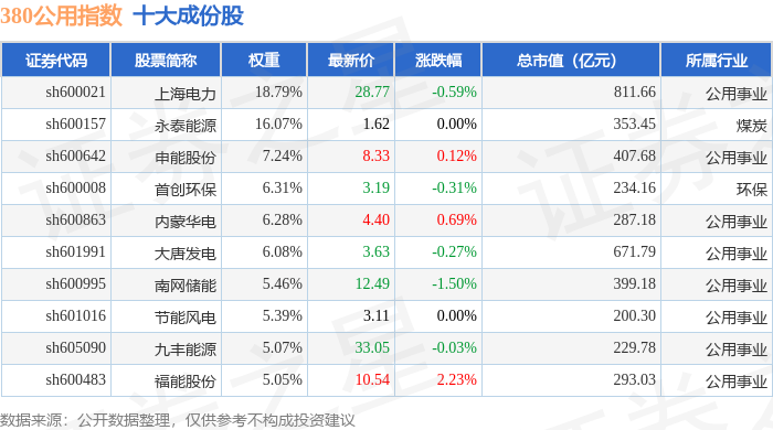 证券之星消息,11月4日,380公用(000113)指数报收于3188.73点,跌0.12%,成交66.13亿元,换手率1.28%。当日该指数成份股中,上涨的有6家,新天绿能以2.64%的涨幅领涨,下跌的有8家,涪陵电力以2.2%的跌幅领跌。